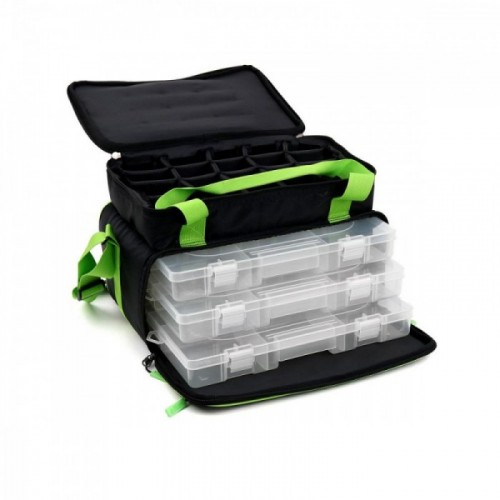 Практичный дизайн и высокое качество сумки с тремя большими прозрачными пластиковыми коробками (36х23х5см) делают ее универсальной и незаменимой. Коробки располагаются в нижней части и имеют по 15 отделений, а в верхней части сумки большое пространство, которое предназначено для хранения кормушек и прочих аксессуаров небольшого размера. Верхнее и нижнее отделения закрываются клапанами на "молнии". На клапане с коробками расположен один сетчатый карман. Сумка имеет прочные ручки, а также толстый мягкий ремень для переноски на плече.