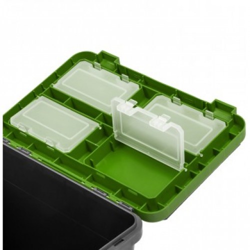 Основной отсек предназначен для переноски рыболовных снастей, термоса, так же удобен для перевозки улова. На внутренней стороне крышки размещены 4 отеделения с полупрозразчными крышечками для хранения мелких аксессуаров.